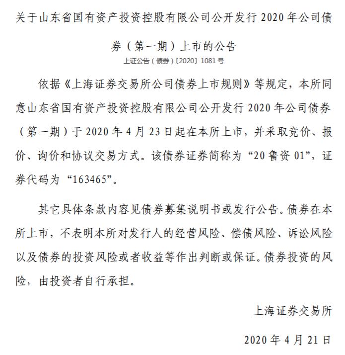 山东省国有资产投资控股有限公司(以下简称“山东国投”)向合格投资者公开发行总额不超过人民币50亿元(含50亿元)的公司债券在获得中国证监会核准后,于2020年4月15日成功完成2020年公司债券(第一期)(以下简称“本期债券”)的簿记建档发行。山东国投本期债券发行规模为人民币10亿元,债券简称为20鲁资01,债券代码为163465,发行利率为3.28%,债券期限为5年,主体/债项评级皆为AAA。